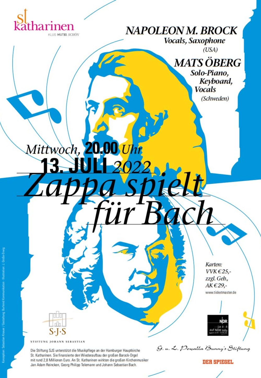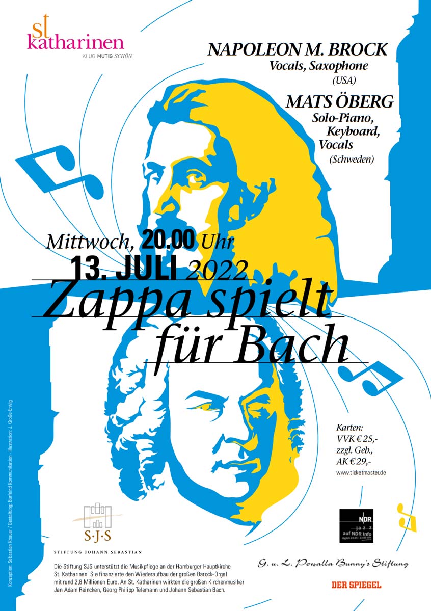 Auch Napoleon Murphy Brock, Jahrgang 1945, musste schwer Noten, Tonarten und Tempiwechsel büffeln, um Anfang der Siebziger Jahre als Leadsänder und Saxoponist bei den „Mothers of Invention“ aufgenommen zu werden. „Das war ein völliger neuartiger musikalischer Kosmos für mich“, sagt er heute, „Frank Zappa hat keinerlei Notenständer auf der Bühne erlaubt.“ Im zweiten Teil des Konzerts begleitet Mats Öberg Napoleon am Keyboard auf einer Reise durch diesen Kosmos mit dem Programm „Zappa pure“. Die Zappa-Standards „Oh No“, „Uncle Meat“ oder „Peaches En Regalia“ werden von den beiden Ausnahmetalenten in einem eingespielten Duett vielschichtig dargeboten. Ob kontrapunktische Basslinie oder virtuoses Mundharmonikaspiel - das Duo knüpft an die barocke Kunst der Improvisation über ein Thema an, wie es bei Georg Philipp Telemann, der als Director Musices Jahrzehnte an St. Katharinen wirkte, von den Musikern gefordert wurde. Solo, Duo, Tutti – Zappajünger kennen keine Grenzen.
