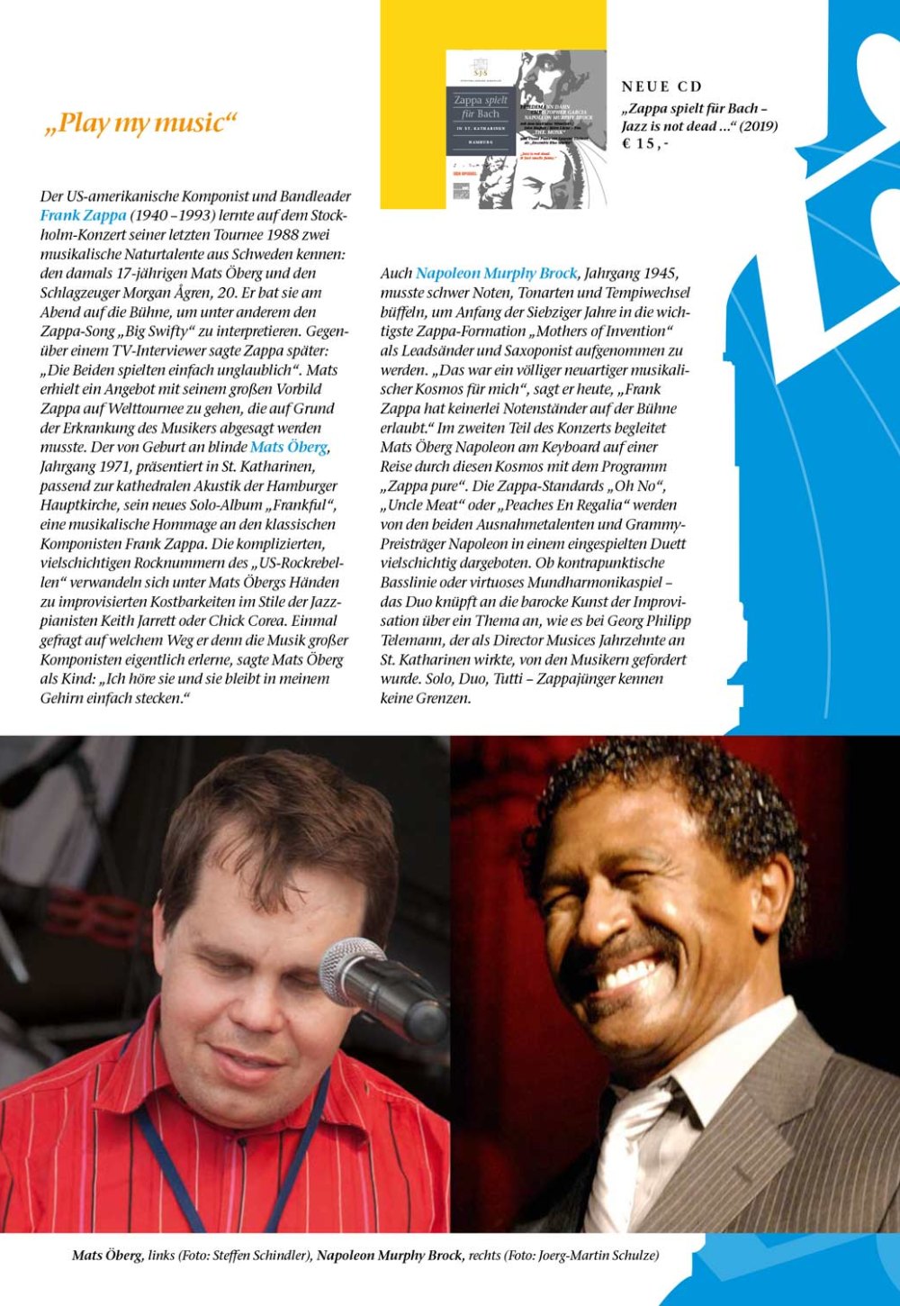 Frank Zappa lernte auf dem Stockholm-Konzert seiner letzten Tournee 1988 zwei musikalische Naturtalente aus Schweden kennen: den damals 17-jährigen Mats Öberg und den Schlagzeuger Morgan Ågren, 20. Er bat sie am Abend auf die Bühne, um unter anderem „Big Swifty“ zu interpretieren. Gegenüber einem TV-Interviewer sagte Zappa später: „Die Beiden spielten einfach unglaublich“. Mats erhielt ein Angebot mit seinem großen Vorbild Zappa auf Welttournee zu gehen, die auf Grund Zappas fortgeschrittener Erkrankung abgesagt werden musste. Der von Geburt an blinde Mats Öberg, Jahrgang 1971, präsentiert in St. Katharinen, passend zur kathedralen Akustik der Hamburger Hauptkirche, sein neues Solo-Album „Frankful“, eine musikalische Hommage an den klassischen Komponisten Frank Zappa. Die komplizierten, vielschichtigen Rocknummern verwandeln sich unter Mats Öbergs Händen zu improvisierten Kostbarkeiten im Stile der Jazzpianisten Keith Jarrett oder Chick Corea. Einmal gefragt auf welchem Weg er denn die Musik großer Komponisten eigentlich erlerne, sagte Mats Öberg als Kind: „Ich höre sie und sie bleibt in meinem Gehirn einfach stecken.“