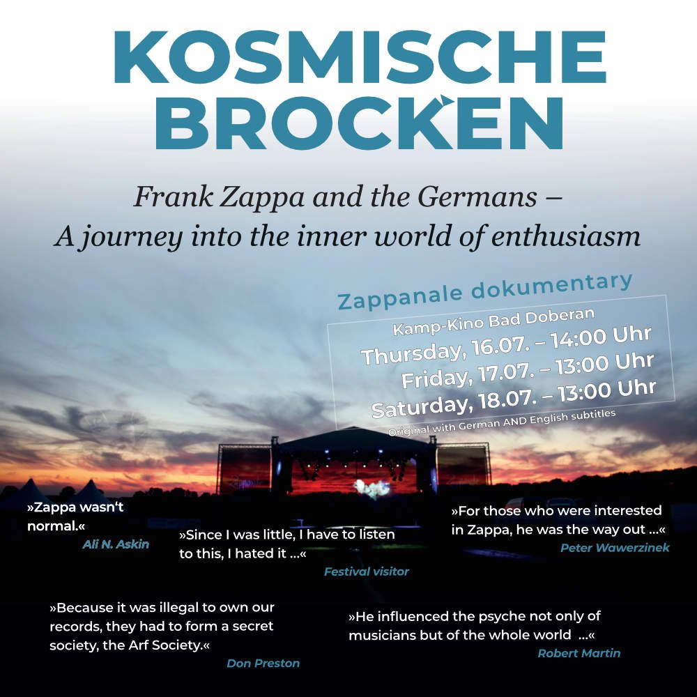 Es kommen auch viele Fans zu Wort, von denen eine ganze Reihe von Anfang an bei der Zappanale dabei waren. Einen besseren Überblick über das Festival, seine Geschichte, die Höhepunkte und die Macher kann man kaum bekommen: Der Dokumentarfilm KOSMISCHE BROCKEN läuft vor und während der Zappanale in mehreren Vorstellungen im Kamp-Kino in Bad Doberan – mit deutschen und englischen Untertiteln!
