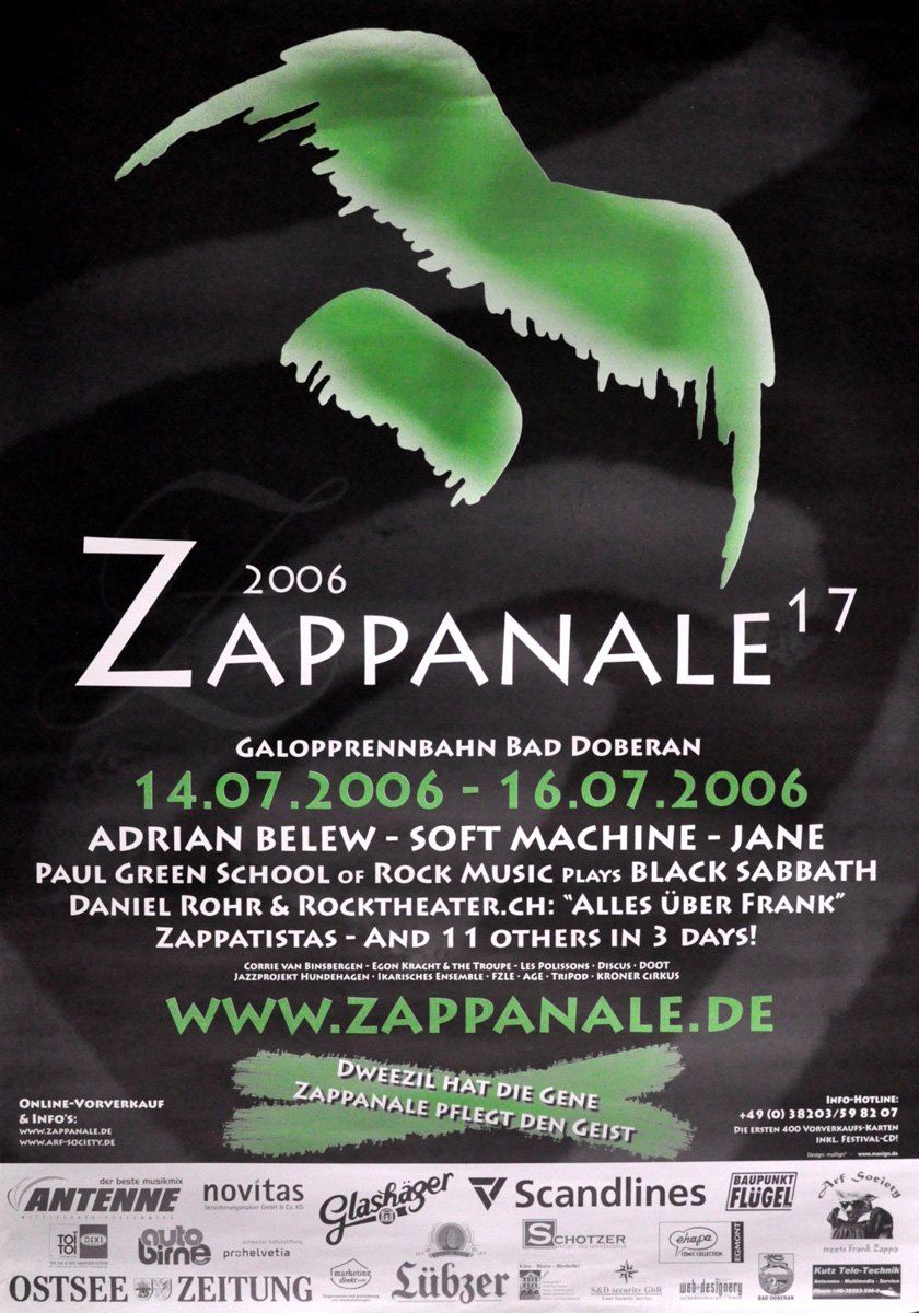 Zappanale 17 - 2006Blue skies everywhere. Sunbeams bore into the pores. A light breeze from time to time from the nearby Baltic Sea. Great weather for this year's 17th Zappanale. Except for Saturday evening, there were probably fewer guests who attended the rock festival in Frank Zappa's name in 2006; There was no less enthusiasm, a less eclectic programme. There is probably no other rock festival in Germany that offers a stage for such an extraordinary programme, such unconventional and often avant-garde bands. In addition, bands that have nothing to do with Zappa and little to do with the festival climate can present themselves during the earlier day before the actual program, this year a young band inherited from 70s Brit-Punk, gothic metallers and a Dresden band Blues band who had a stage and an audience for free. Every year the fan has to carry the vague hope that the festival, which has been financially stricken for years, will be continued for the coming year, but this year Wolfhard "Spain" Kutz - head of the Zappanale company - said he did not want to stop the event and to dare a new challenge.